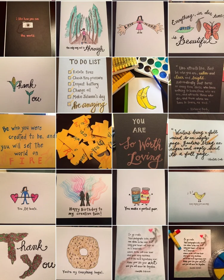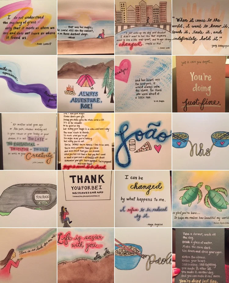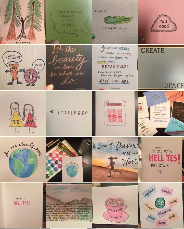Three weeks into this project, a friend approached me and asked, "You're making all of these handmade cards everyday. Who are you sending them to?" The truth was, they were piling up in my closet. I was embarrassed. So on Day 24, I reached out on Instagram, explained my #100DayProject, and invited anyone who wanted to receive a handmade card to send me a direct message with their address. I was overwhelmed by the response. Old high school friends, college friends who I hadn't seen in years, and complete strangers messaged me. It was delightful. The most enjoyable process was creating for a person who I'd never met before, scrolling through their Instagram feed to grasp how they saw the world and what they found beautiful, and creating a card that mirrored back to them words of encouragement. It was the most fulfilling and rewarding creative challenge. As humans, we have a fundamental need to create things. But when our art can be used to encourage and speak life into others, then it becomes meaningful work.